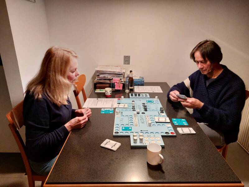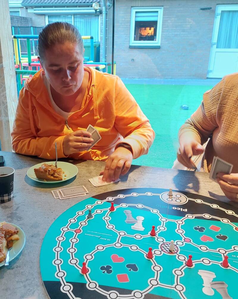 Heidi en Maria spelen/testen een nieuw kaartspel van De Bordspellenman.