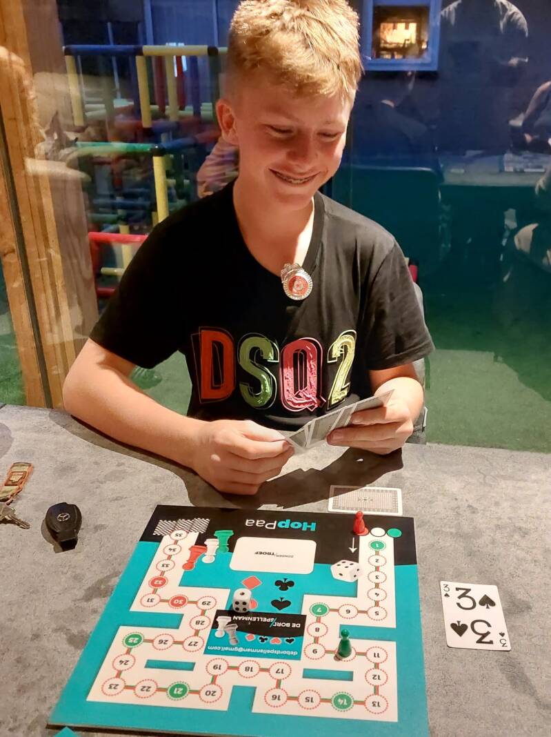 Djeano is tevreden met zijn kaarten en met het spel HopPaa.