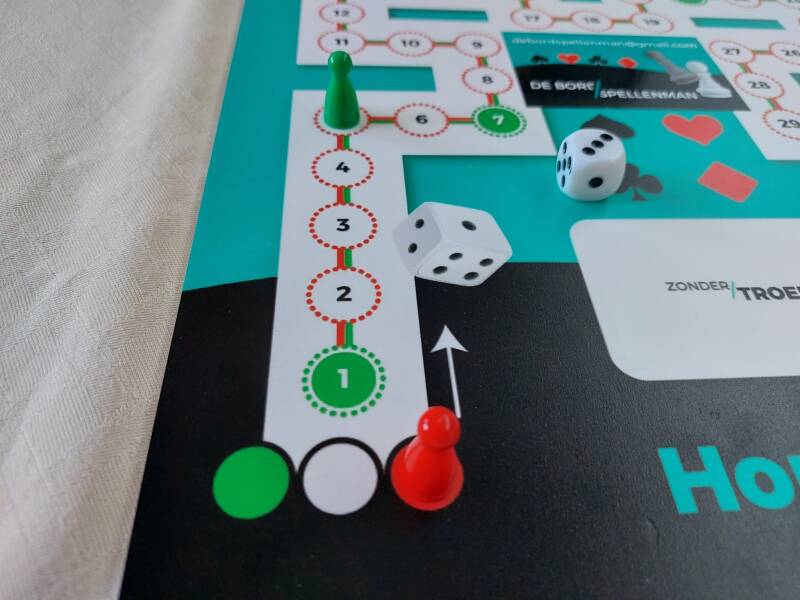 Als een pion op het rode getal 30 of het rode getal 32 komt dan moet deze pion terug gezet worden naar het groene getal 25.