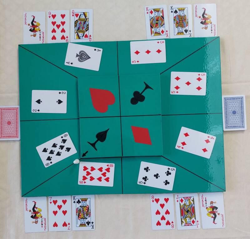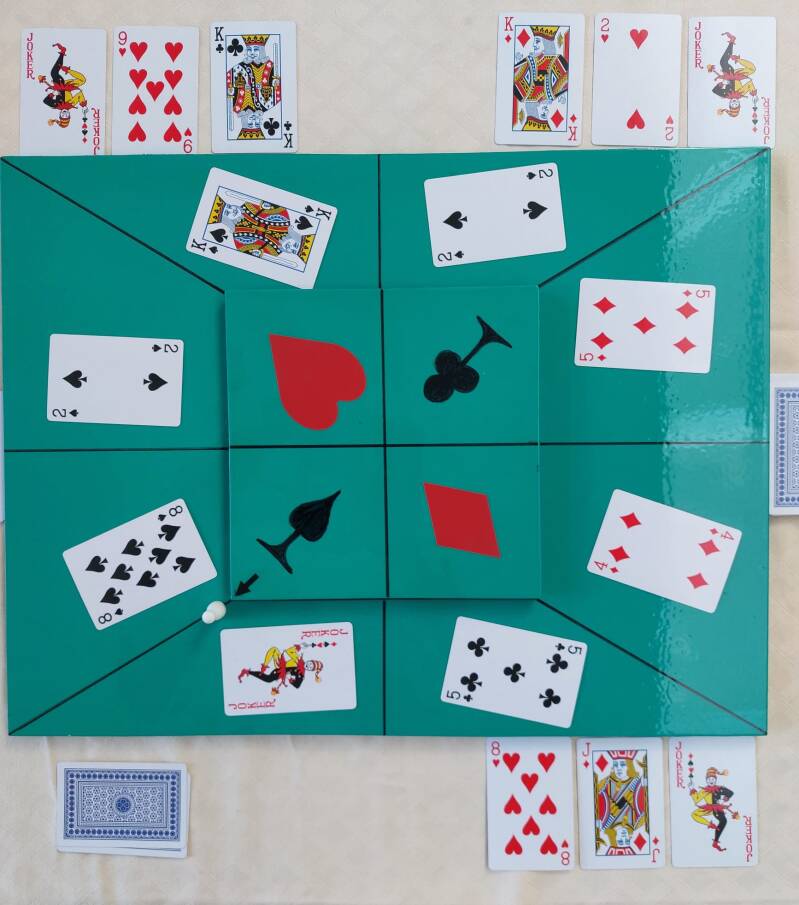 Bovendien ligt er nog een jokerkaart op tafel die hij voor elke handkaart mag gebruiken, behalve klaveren kaarten.