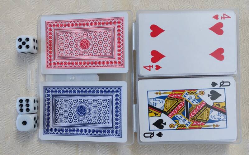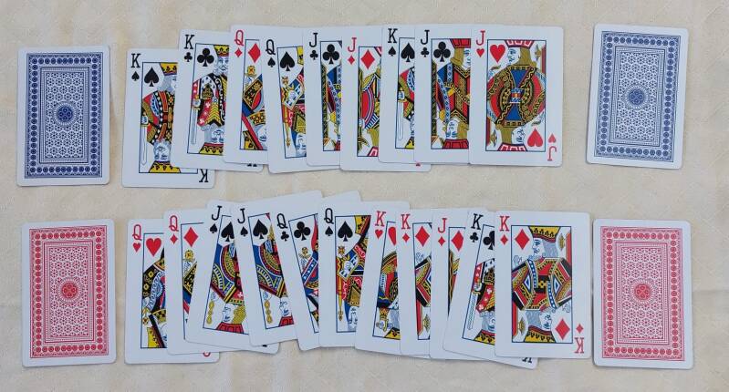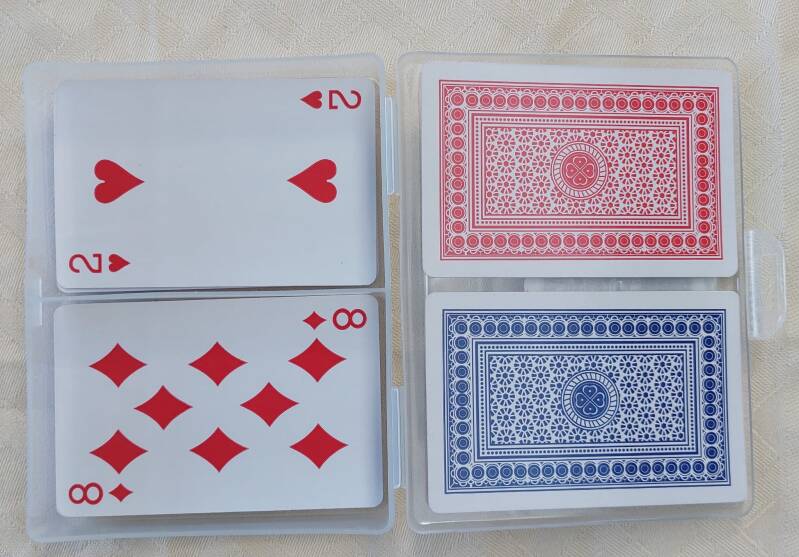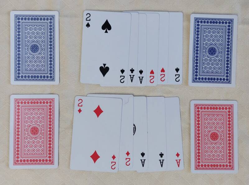 - Twee stapels speelkaarten: één met een blauw dek en één met een rood dek.