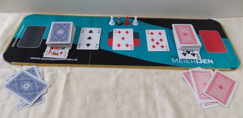 - De overige twee vakken zijn voor de trekstapels van speler rood en speler blauw.