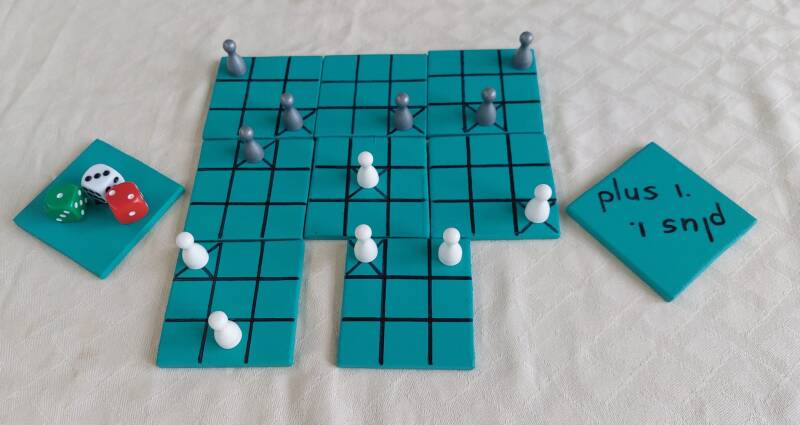 Wanneer een speler dubbele getallen over houd van de drie dobbelstenen, moet hij een tegel verplaatsen in plaats van een pion.