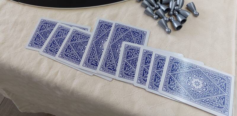 In de eerste deelbeurt speel je acht kaarten weg van de negen gekregen kaarten.